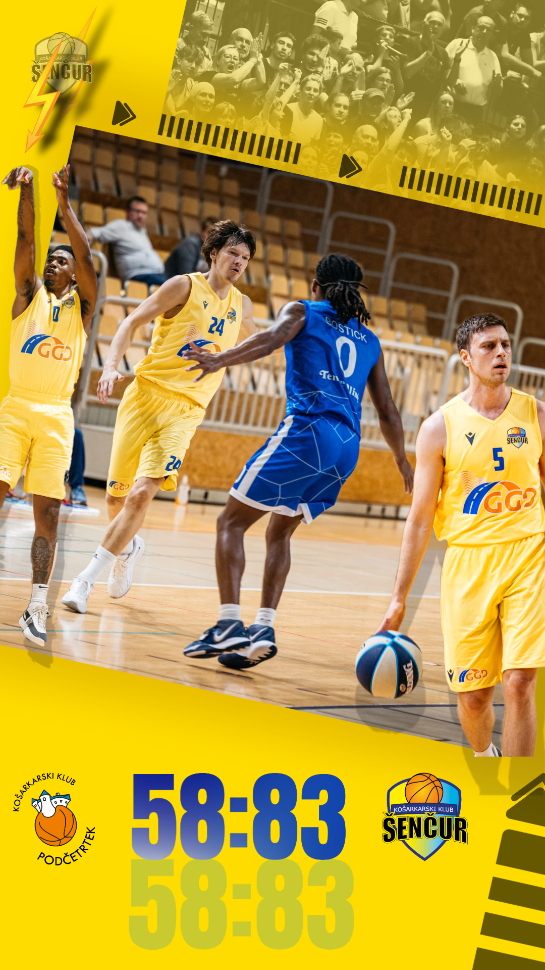 Za vse ekipe v slovenskem prvenstvu je gostovanje v Podčetrtku zahtevno in večina jih topliško mestece na vzhodu Slovenije zapušča slabše volje. No tokrat je članska ekipa Gorenjske gradbene družbe Šenčur pokazala zobe in s hitro in všečno igro povsem razorožila Terme Olimia Podčetrtek. Domači so v primerjavi z lansko, za njih najbolj uspešno sezono v zgodovini kluba, precej spremenjeni, med tem, ko je osnova šenčurske zasedbe še lanska. Na zunanjih položajih sta dva nova košarkarja, Jaka Klobučar in Brandon Murray, opravil levji delež in po izenačeni prvi četrtini je GGD Šenčur dvignil ritem igre in ob polčasu je bilo +17 (28:45). Ko je bilo 16 minut pred koncem +26, je bilo jasno, da se bodo gostujoči košarkarji z nasmehom vračali v osrčje Gorenjske. Končnih 58:83 je odraz odlične obrambe in kolektivne igre. GGD Šenčur je dobil skok 53:39, izgubil manj žog 15:20 in dosegel 23 točk iz drugih napadov; domači le 7. Pri Podčetrtku je bil dvomesten le Copot (15 točk), pri GGD Šenčur pa je Murray dosegel 16 točk, Filip Krajina 14, po 12 pa Jan Novak in Klobučar.