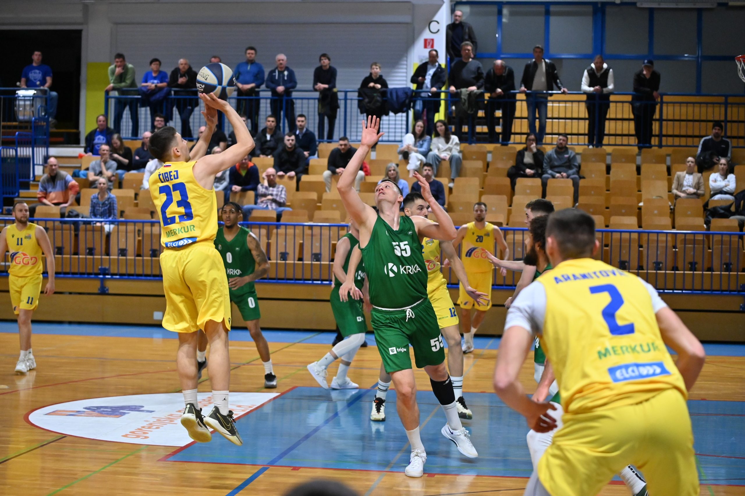 Domača ekipa je povedla s 14:8, nato je Krka odgovorila in na prvi premor odšla z majhno prednostjo (19:21). V drugi četrtini si dolgo nihče ni priigral prednosti dveh posesti, vse do 18 minute, ko je GGD Šenčur, po dveh prostih metih in polaganju Mateja Čibeja povedel s 40:34. Ob koncu polčasa je za dve zadel še Vukašin Todorović in na daljši premor je GGD Šenčur odšel s prednostjo 44:36.